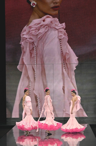 A rosada base, rouge ruffles and sections of upper body and hemline tassles gently swaying down the catwalk. Design by Juan Manolo.